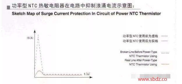 功率型NTC熱敏電阻器在電路中抑制浪涌電流示意圖: