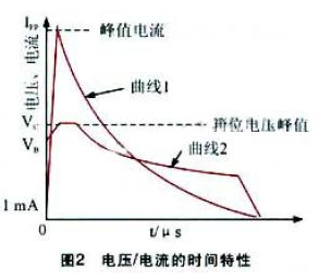 圖2 是在雙蹤示波器上觀察到的TVS 管在承受大電流沖擊時(shí)的電流及電壓波形。圖中,曲線1 是TVS 管中的電流波形,可以看出:其流過TVS 管的電流由1mA 突然上升到峰值后,然后按指數(shù)規(guī)律下降。曲線2 是TVS 管兩端的電壓波形,它表示TVS 中的電流突然上升時(shí),TVS 兩端電壓也隨之上升。在浪涌電壓的作用下,TVS 兩極間的電壓由額定反向關(guān)斷電壓VRWM 上升到擊穿電壓VB 而被擊穿。隨著擊穿電流的出現(xiàn),流過TVS 的電流將達(dá)到峰值脈沖電流IPP,同時(shí)其兩端的電壓被箝位到預(yù)定的最大箝位電壓VC 以下。其后,隨著脈沖電流按指數(shù)衰減,該過程中,TVS 兩極間的電壓也不斷下降,最后恢復(fù)到初態(tài),這就是TVS 抑制可能出現(xiàn)的浪涌脈沖功率,保護(hù)電子元器件的過程。事實(shí)上,當(dāng)TVS 兩極受到反向高能量沖擊時(shí),它能以10-12s 級(jí)的速度,將其兩極間的阻抗由高變低,以吸收高達(dá)數(shù)千瓦的浪涌功率,使兩極間的電位箝位于預(yù)定值,從而有效地保護(hù)電子設(shè)備中的元器件免受