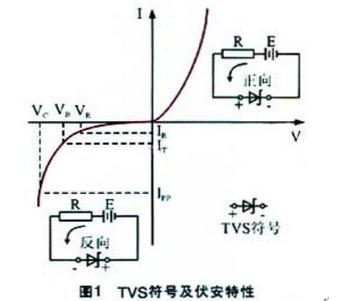 TVS是普遍使用的一種新型高效電路保護(hù)器件,它具有極快的響應(yīng)時(shí)間(亞納秒級(jí))和相當(dāng)高的浪涌吸收能力。當(dāng)它的兩端經(jīng)受瞬間的高能量沖擊時(shí),TVS能以極高的速度把兩端間的阻抗值由高阻抗變?yōu)榈妥杩?,以吸收一個(gè)瞬間大電流,從而把它的兩端電壓箝制在一個(gè)預(yù)定的數(shù)值上,從而保護(hù)后面的電路元件不受瞬態(tài)高壓尖峰脈沖的沖擊。正因?yàn)槿绱?,TVS 可用于保護(hù)設(shè)備或電路免受靜電、電感性負(fù)載切換時(shí)產(chǎn)生的瞬變電壓[4],以及感應(yīng)雷所產(chǎn)生的過電壓。圖1所示為TVS 的符號(hào)及伏安特性曲線。